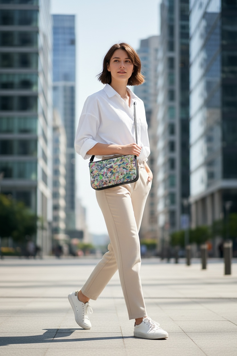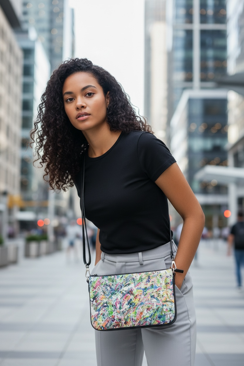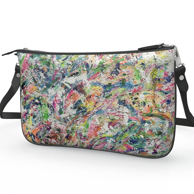 Based on a large abstract from Jess's private collection, bring some unique style into your life with this one-of-a-kind painting on a luxurious leather handbag. The 2 zippered pouches keep your valuables organized, and the purse works double duty as a shoulder bag or crossbody. The double pochette is fantastic to grab and go everywhere, with every color you may be wearing! Imagine wearing it with jeans and a solid tee or sweater, or with a flowy white sundress. She holds her own as a show-stopping evening bag as well. Choose your hardware color and order today! Be bright. Be happy. Limited edition with certificate of authenticity.