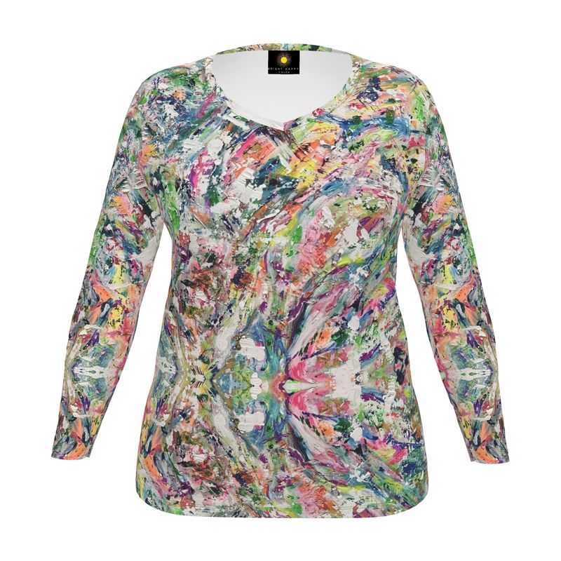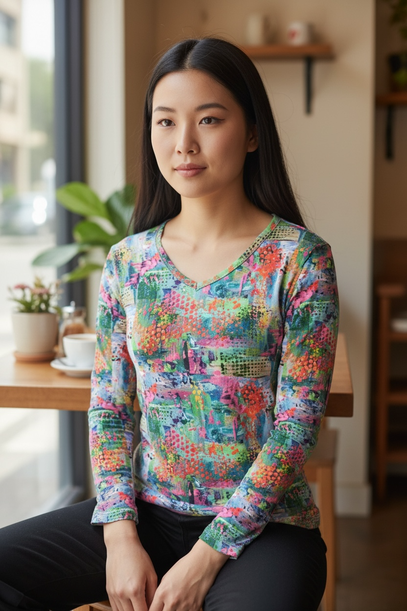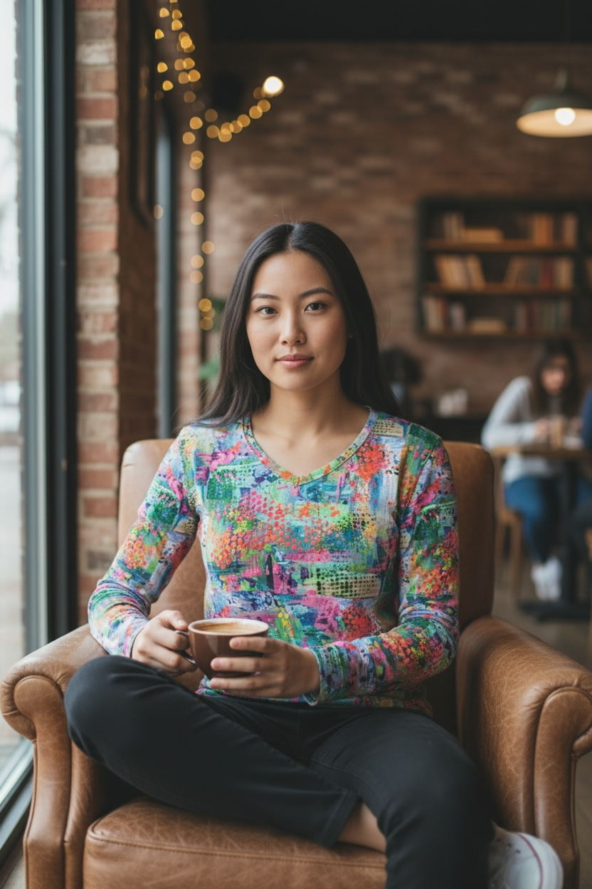 Layer up, stay warm, and look your cutest in this splashy neon tee with a burst of fresh energy will add a workhorse layer to your wardrobe, whether you select a long sleeve or short sleeve. Pair with a Bright Happy Color bold floral hoodie to make a loud statement or a solid topper for a more subtle nod to wearable art. Whatever you choose...Stay bright. Stay happy.