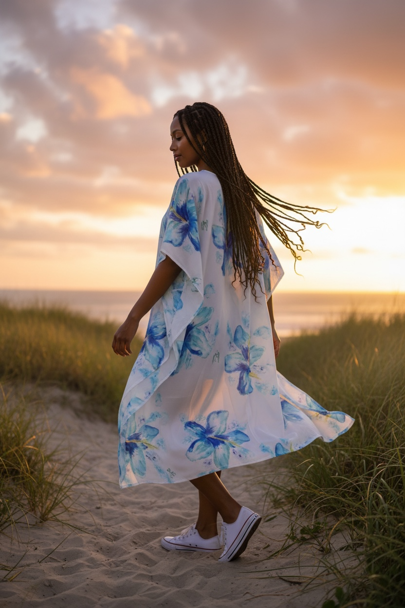 Soft blue hibiscus motifs float across a luminous white ground, creating a sense of ease, clarity, and quiet beauty. The pattern feels light and airy - like petals carried by a coastal breeze - balancing softness with confident presence. It's effortless yet expressive, ideal for moments when you want to feel both grounded and radiant.