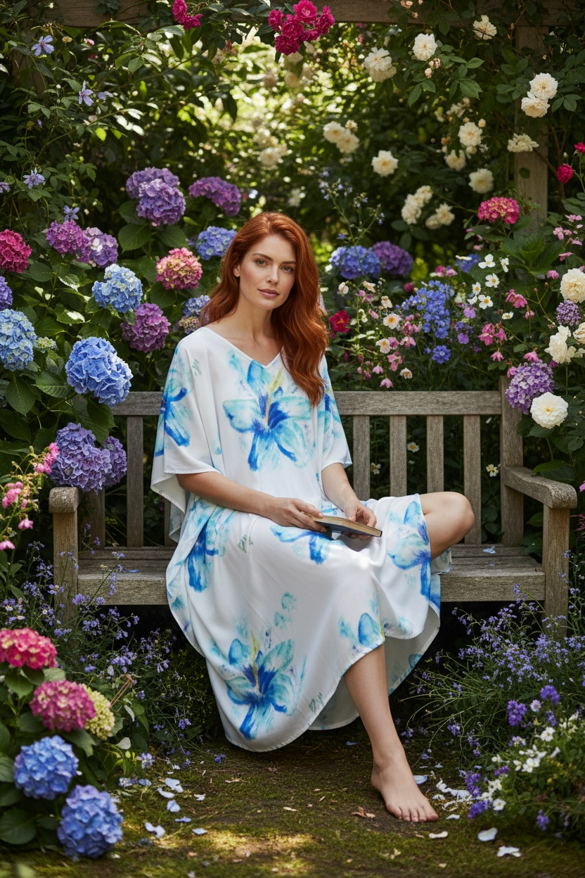 This silk caftan with flowing butterfly sleeves is available in petite and regular lengths. Perfect over a bathing suit poolside, at the bar, or in the evening.