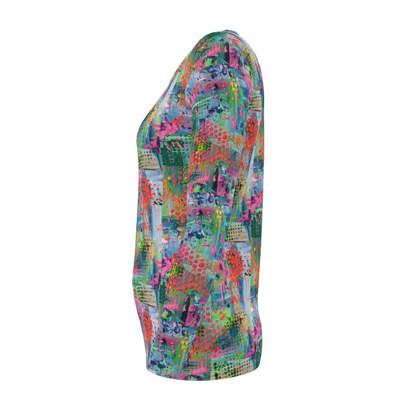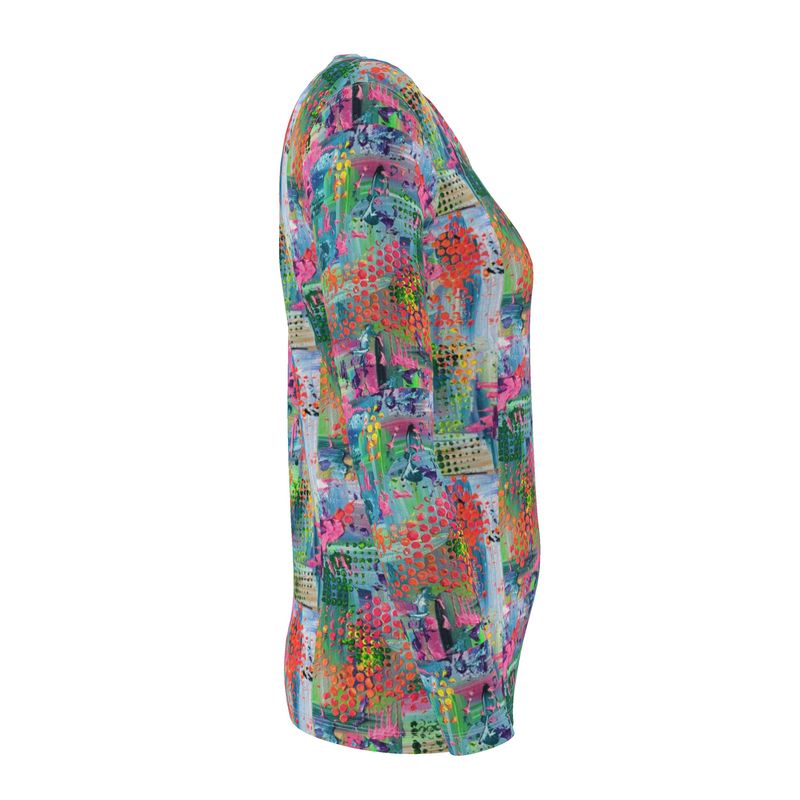 A couture layer when you feel like taking it easy to dress, while adding a piece of wearable art. This cheerful tee comes in a selection of soft, comfortable fabrics. Choose your neckline, as well as long or short sleeves. A perfect choice to layer under a hoodie or cardigan. Select accessories from the Bright Happy Collection to compliment this abstract top.