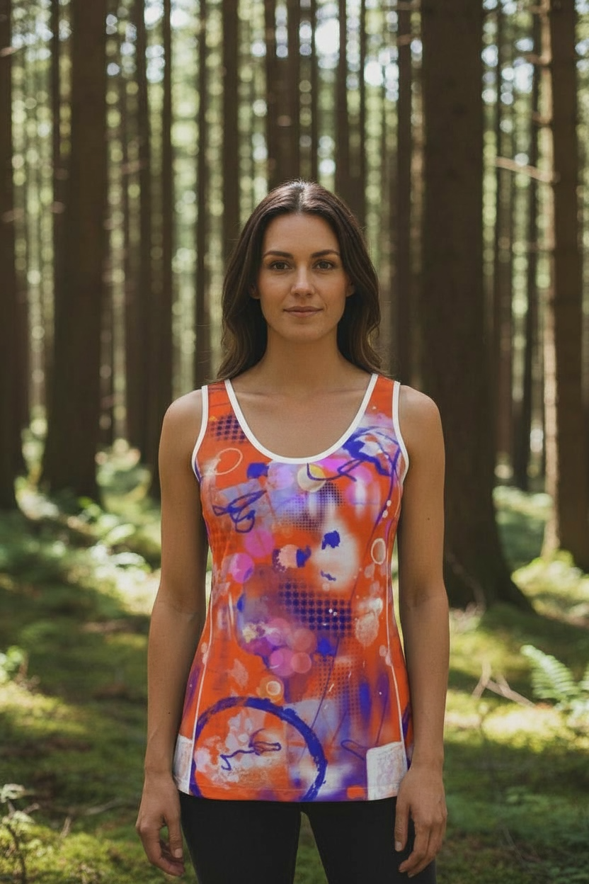 Stay cool or layer under a cute hoodie or denim jacket with this bright, vibrant abstract orange and blue tank top. Embrace your curves and cheer proudly! Stay bright. Stay happy.